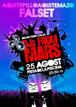 Ya veis que los DJs From Mars son extraterrestres muy extrovertidos y con un gran sentido del humor y, por supuesto, de la música, así que desde MashCat os recomendamos muy sinceramente que no faltéis a la fiesta que se montará en la pista de la Piscina de Falset el 25 de agosto (próximo sábado), Aquí te pillo aquí temazo, porque va ser algo parecido a esto:/Now you see thatDJs From Marsare very nice aliens with a great sense of humour and, of course, a great musical sense, so from MashCat we sincerely recommend you don’t loose the party it’s going to be at pista de la Piscina de Falset on 25th of August (next Saturday), Aquí te pillo aquí temazo, because it’s going to be something like that: