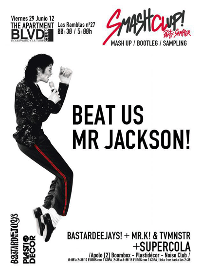 Nueva cita con el Mashup en Barcelona: Smash Clup Party Sampler. Esta vez dedicada al gran Michael. En esta ocasión, aparte de los habituales Bastardeejays (TvMnstr & Mr.k!), también contaremos con el dúo SuperCola (un portento creando mashups electrónicos a lo Loo & Placido).