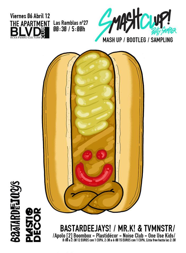 Posted: abril 4, 2012 Filed under: Directos, DJs de Mashup, DJs de Mashup de España, Mashup, Mixtapes de Mashup, Noticias y más | Tags: Bastardeejays, Boulevard Culture Club, Mr.k!, Smash Clup Party Sampler, TvMnstr 4 Comments »Después de haberte preparado un buen batido con todo lo que pillabas en tu nevera, haberte peleado con tu compañero de piso por que disco poner, cenado una hamburguesa de seis pisos, o una buena pizza, o un «chuchito caliente» con mucha mostaza y ketchup, llega de la mano de los Bastardeejays (el equipo bastardo formado por TvMnstr & Mr.k!), la 5 edición de la Smash Clup Party Sampler: la primera fiesta del Mashup de España.