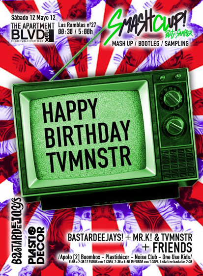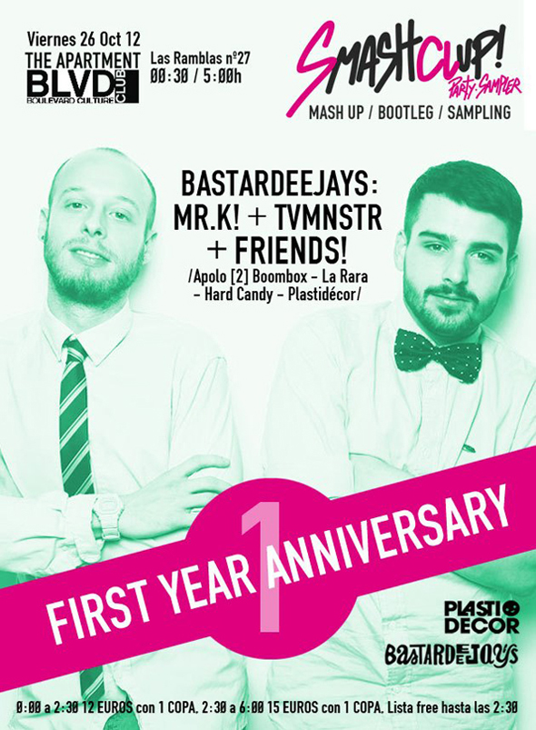 La Smash Clup Party Sampler celebra su primer aniversario en la sala Boulevard Culture Club. La noche irà a cargo de los Bastardeejays (TvMnstr & Mr.k!), peo se anuncia cava y de buen seguro que habrá más sorpresas!!